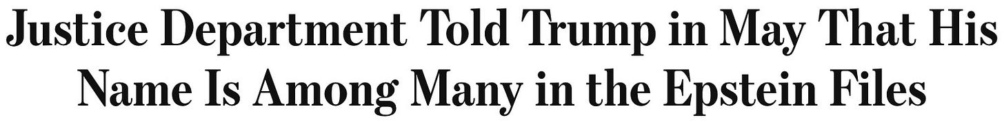 that’s the moment Donny changed his tune. now, the Epstein Files are a hoax — a hoax that’s quite conveniently been cooked up by every person Donny holds a grudge against: Obama. Hillary. Comey. Biden. what an amazing rogue’s gallery. how long before Donny adds Stephen Colbert to the mix?