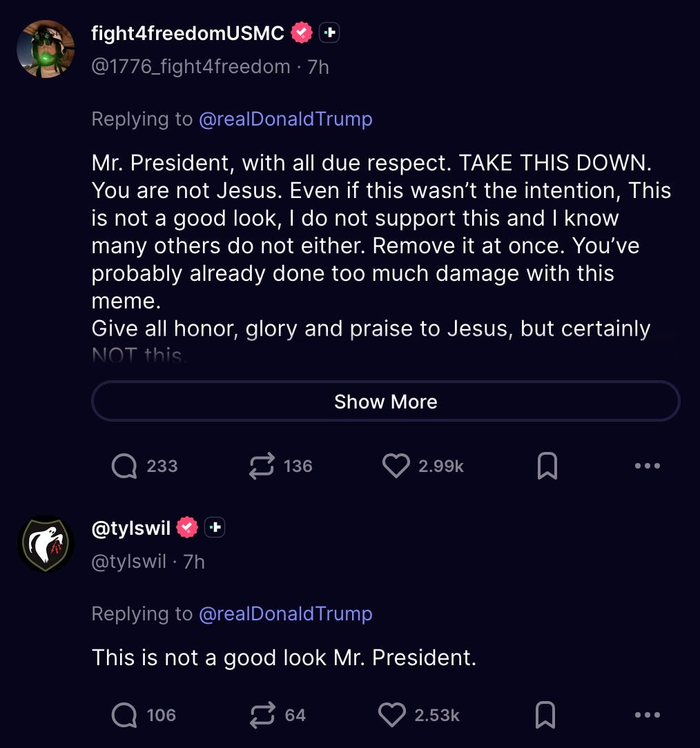 The image evoking Jesus drew swift criticism from some evangelical Christians and conservative Catholics who have otherwise expressed near constant support for Trump’s decisions.