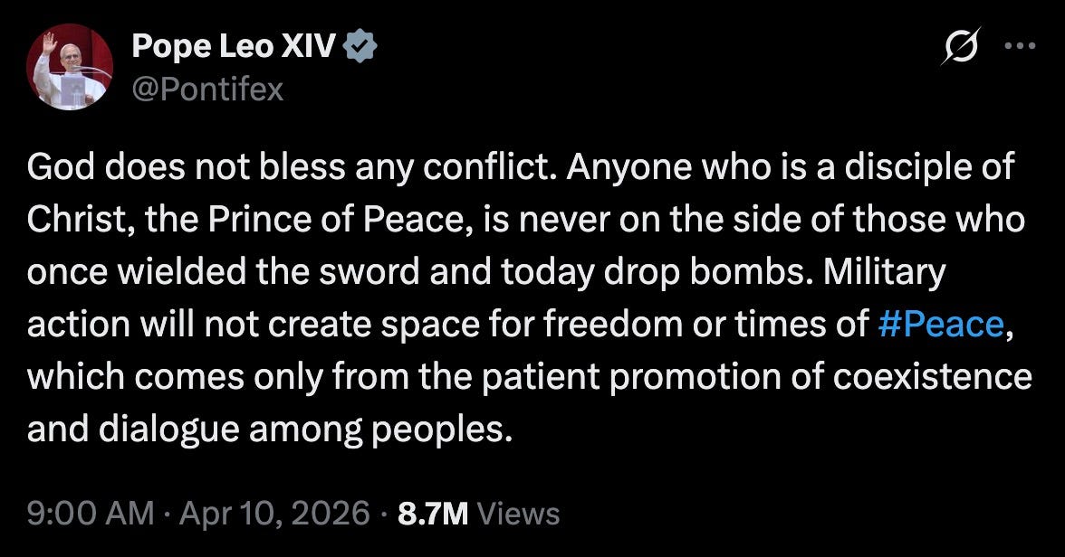 as always, I’m eternally happy to explain. this is all happening because Piss-Drunk Pete Kegstand, America’s Christofascist Secretary of Death, kept yammering on about how ‘God is totally down with our warfighting warfighters warfighting the shit out of Iran’ — Pope Leo was all ‘the fuck he is, Tattoo Boy.’