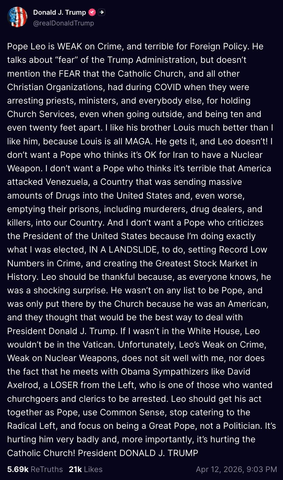 Donny Convict is not a well man, that’s obvious. no duh. but how did we get here, that he’s now going scorched earth against Pope Fucking Leo?