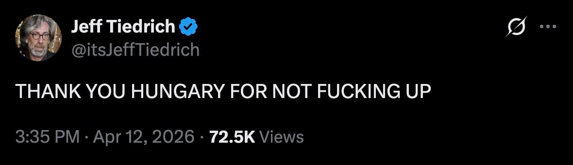 and now, here are your heroes of the day: the awesome people of Hungary, who crushed Donny’s despot bestie Viktor Orbán so thoroughly at the polls yesterday, that he conceded his loss almost immediately.