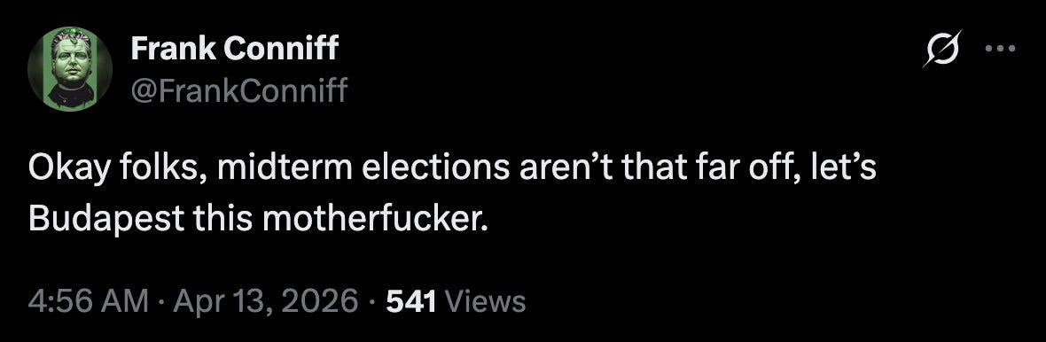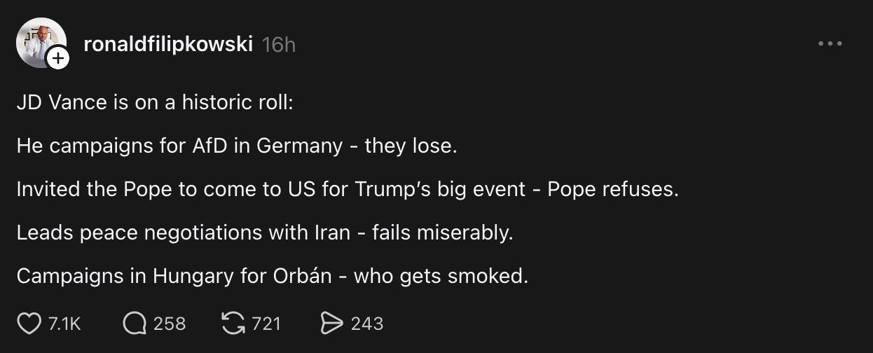 congratulations are in order for Petér Magyar, Hungary’s new Prime Minister-elect — and let’s also congratulate United States Vice President Couchfuck McGee for his unbroken streak of clownfucktacular failure.