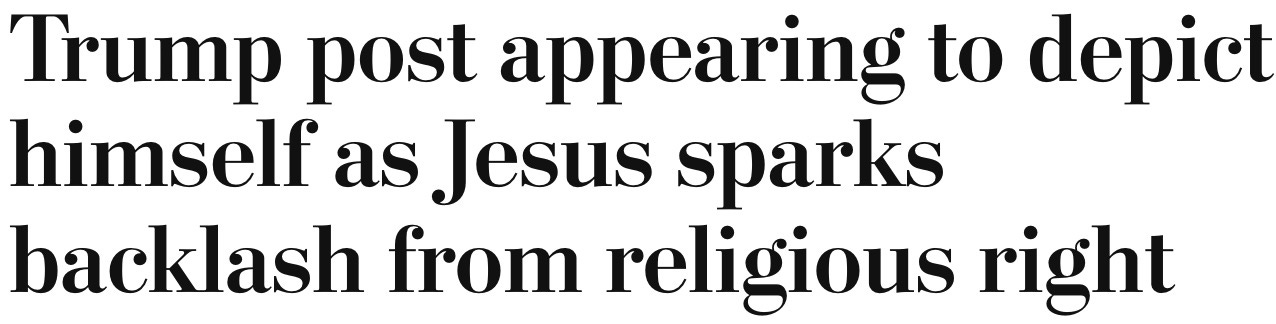 you really do have to love the Washington Post. is there no behavior of Donny’s that they won’t try to sanewash? to them, Donny’s tweet merely ‘appears’ to depict himself as Jesus. way to pull your punches, WaPo. you’re adorable. don’t ever change.