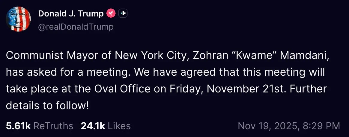 and that’s when The Mamdaninator sprung into action — because at the same time this fuckery was being perpetrated, Zohran was quite coincidentally on his way to DC for an already-scheduled meeting at the White House, in order to sweet-talk Donny into funding a massive affordable housing project in NYC.