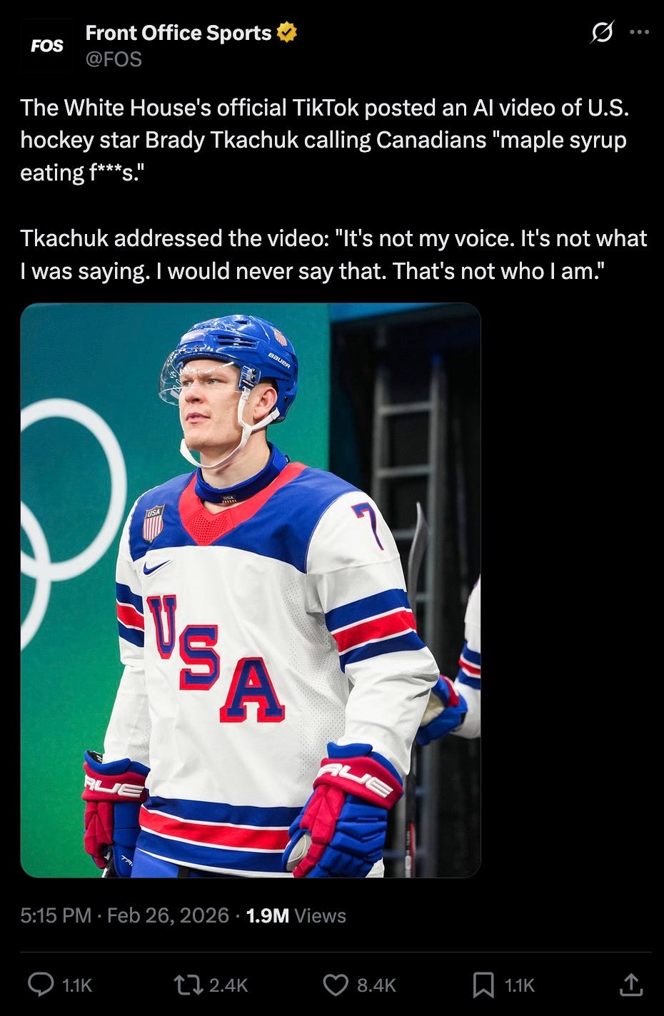 for his obsequious kowtowing to Dear Leader, the White House paid him back in the most fucked-up way possible: the official White House tiktok account posted a fake AI video in which an overdubbed Tkachuk calls Canadians ‘maple-syrup-eating fucks.’
