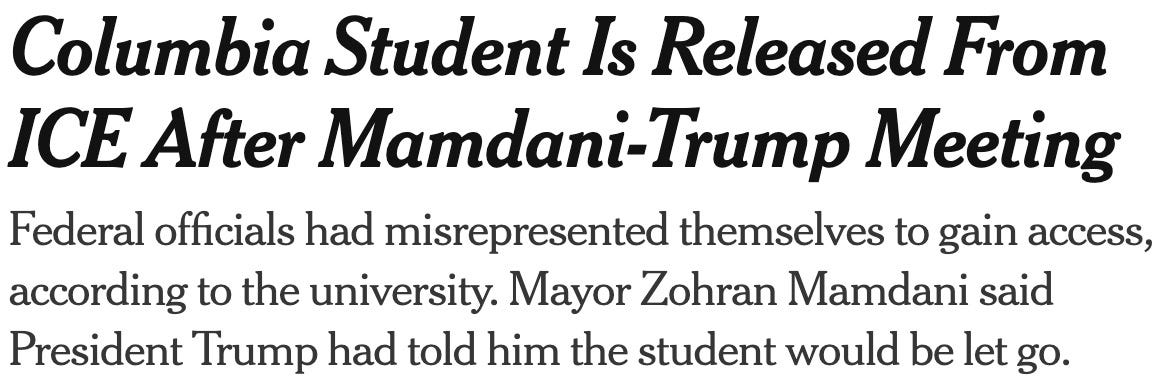 Zohran Mamdani is so fucking good at playing Donny — because look at this: Mamdani got everything he wanted. he got the housing project funded — and he got the detained student freed. art of the fucking deal, am I right?