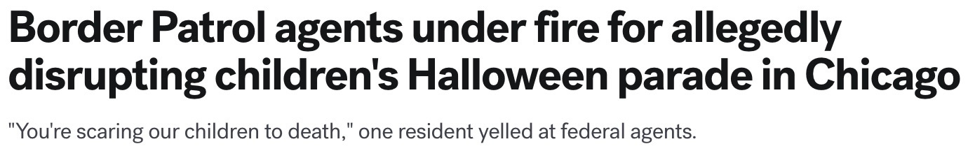why is Pritzker so worried that children in Chicago might get tear-gassed during Halloween? because it already happened once this week, that’s why. tell me, when masked ICE shitkazoos tear-gassed a children’s a children’s Halloween parade in Chicago a few days ago, was that ‘keeping them safe’?
