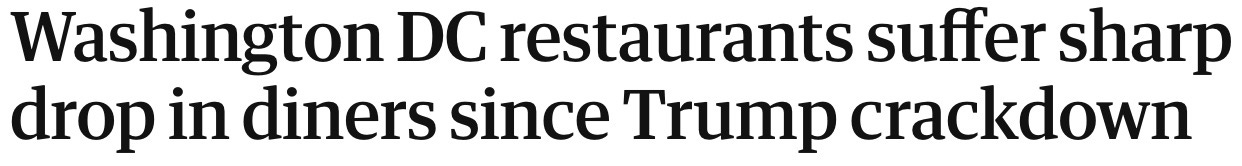 Research by Open Table found that restaurant attendance was down every day last week compared with 2024, with the number of diners dipping by 31% on Wednesday, two days after Trump ordered the national guard to patrol Washington.