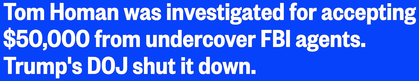 Tom Homan’s ahem alleged crime is on fucking tape. how is that not credible evidence? but this is the shit sandwich that the podcast troll who now heads the FBI, along with Donny’s own personal lawyer Toddy Blank, are shoving in our faces, and going ‘mmm, mmm, isn’t that delicious?’