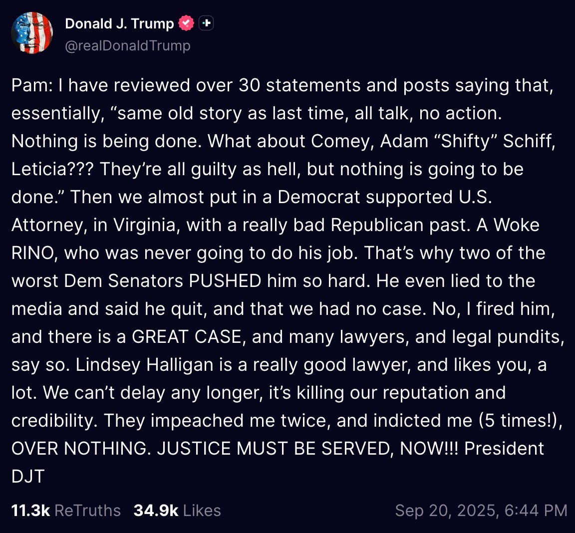 Pam: I have reviewed over 30 statements and posts saying that, essentially, “same old story as last time, all talk, no action. Nothing is being done. What about Comey, Adam “Shifty” Schiff, Leticia??? They’re all guilty as hell, but nothing is going to be done.” Then we almost put in a Democrat supported U.S. Attorney, in Virginia, with a really bad Republican past. A Woke RINO, who was never going to do his job. That’s why two of the worst Dem Senators PUSHED him so hard. He even lied to the media and said he quit, and that we had no case. No, I fired him, and there is a GREAT CASE, and many lawyers, and legal pundits, say so. Lindsey Halligan is a really good lawyer, and likes you, a lot. We can’t delay any longer, it’s killing our reputation and credibility. They impeached me twice, and indicted me (5 times!), OVER NOTHING. JUSTICE MUST BE SERVED, NOW!!! President DJT