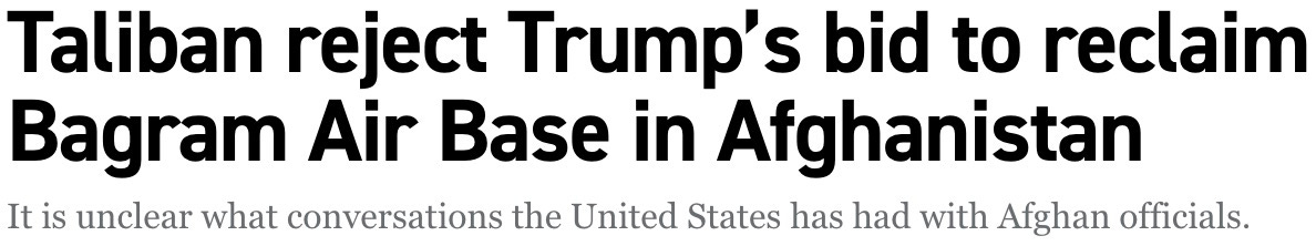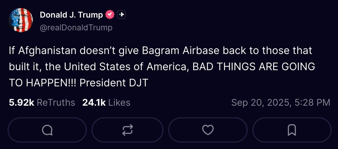 “If Afghanistan doesn’t give Bagram Airbase back to those that built it, the United States of America, BAD THINGS ARE GOING TO HAPPEN!!! President DJT”
