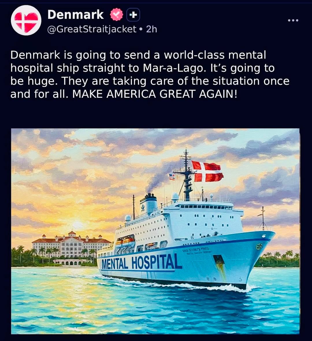 anyway, I think it’s totally awesome of Denmark to offer to send a mental hospital ship to Donny’s Florida golf motel. it’s an idea whose time has come.