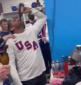 oh look, there he is — in Italy, in the locker room of the US hockey team.