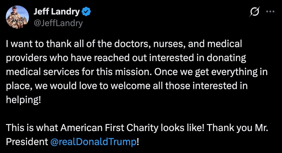 “I want to thank all of the doctors, nurses, and medical providers who have reached out interested in donating medical services for this mission. Once we get everything in place, we would love to welcome all those interested in helping! This is what American First Charity looks like! Thank you Mr. President!”