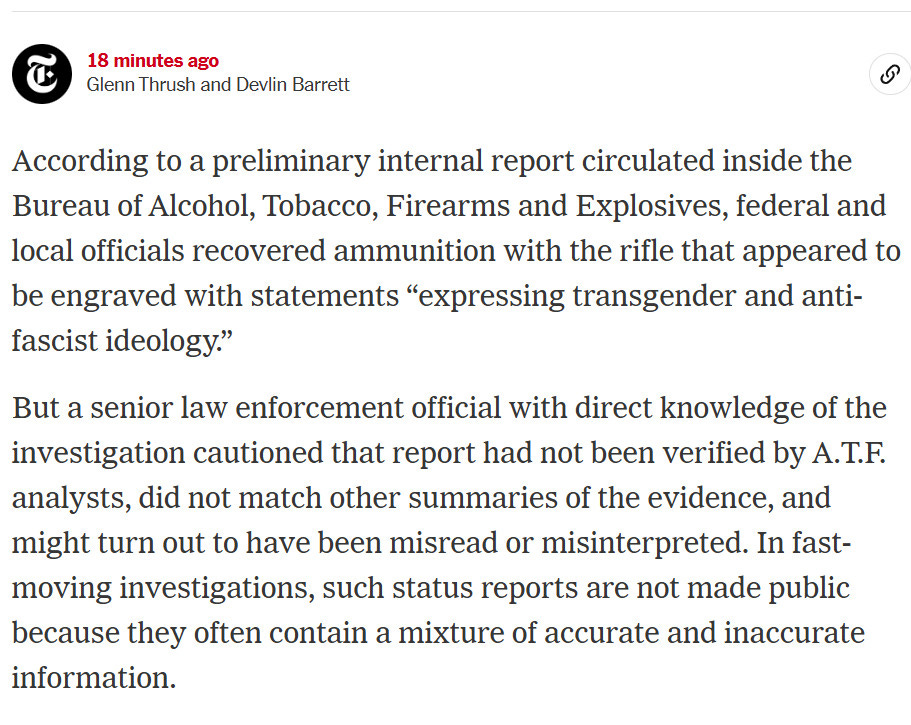 “Breaking: Ammunition engraved with transgender and antifascist ideology was found inside the rifle authorities believe was used in Kirk’s shooting, sources say.”