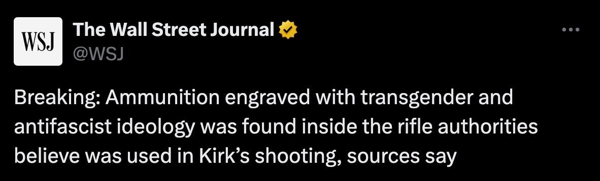 oh, sources are saying this, that the assassin’s bullets were engraved with ‘transgender ideology’? thank god the Journal is getting their information from unnamed government sources who obviously have no anti-trans political agenda to push and would never lie to the media. praise the day. thank you for enlightening us and making our lives ever-more richer, Wall Street Journal.