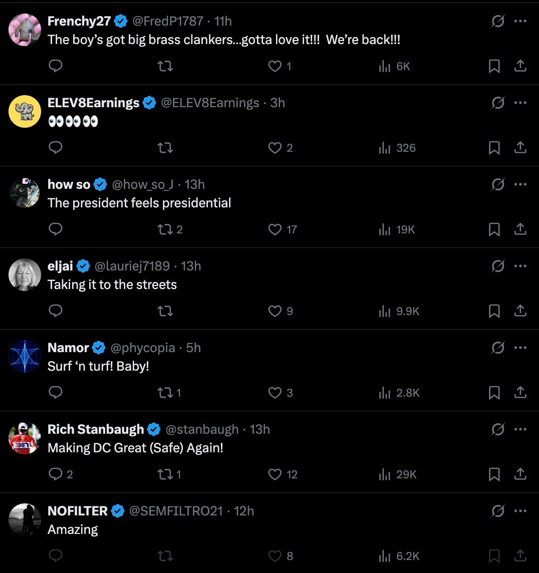 look, of course a city under military occupation is going to be ‘safe.’ very few people are foolhardy enough to do crimes when there are soldiers with guns crawling all over the place. the real question is, is this necessary? — and, more importantly, is this the America we want to live in?