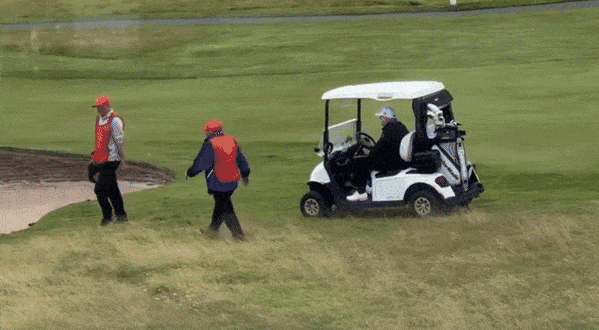 check out what happened yesterday at Donny’s Scotland golf motel. Donny had hit his ball into the rough, or the sand trap — it doesn’t really matter where it is, because Donny’s not going to play that ball. watch: