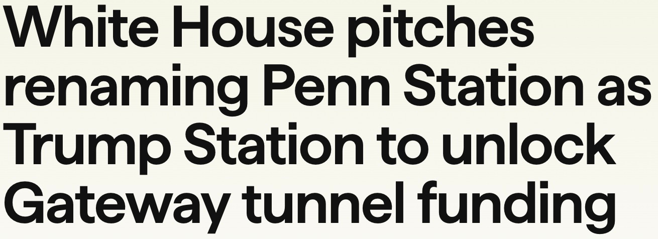 President Donald Trump’s team offered to unfreeze federal funding for the paused Gateway tunnel project if Democrats in Congress agree to rename Penn Station and Washington Dulles International Airport after him, according to someone with direct knowledge of the negotiations.