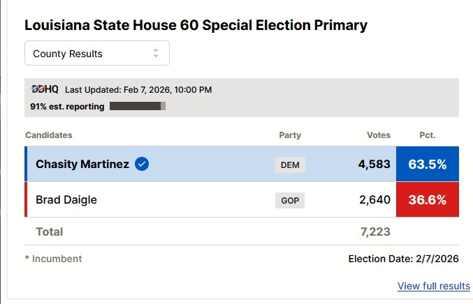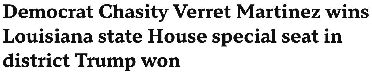 and now for your heroes of the day: the voters of Louisiana’s 60th district, where Democrats flipped a State House seat in a deeply red state.