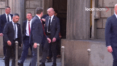 is it any wonder that Mr. Heartbeat Away gets booed everywhere he goes? he pretty much goes out of his way to be as unpleasant as possible. look at the embarrassing spectacle Couchfuck creates as he leaves the Milan Prefecture after meeting with Italian Prime Minister Giorgia Meloni.
