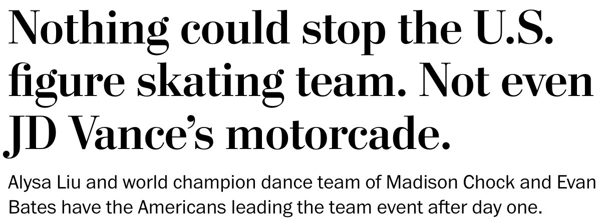 MILAN — The start of the women’s short program at the Olympic figure skating team event was drawing close Friday afternoon, but American star Alysa Liu couldn’t get to the Milano Skating Arena. She and her coach and choreographer were stuck on an official Olympic bus, blocked from the arena parking lot by the motorcade of Vice President JD Vance, who attended the team event. “We almost didn’t make it,” Liu’s coach, Phillip DiGuglielmo, later said.