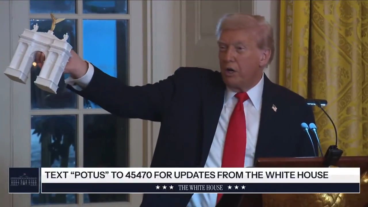 [hold up model] “this is just a model of what it would look like, in either of— in any of the three sizes, which it right here, I don’t know if any of you can see it. sort of— that’s lady liberty. lady— did you ever hear of lady liberty? liberty? on top. but, uh— so the size of this would be very different. now here’s Lincoln. and this is sort of facing this way. and so it’s going to be a direct line. they did this, they didn’t do that. [holds up models] so this would be small, medium and large. small medium and large. and, uh— whichever one, uh, I happen to dig the large.”