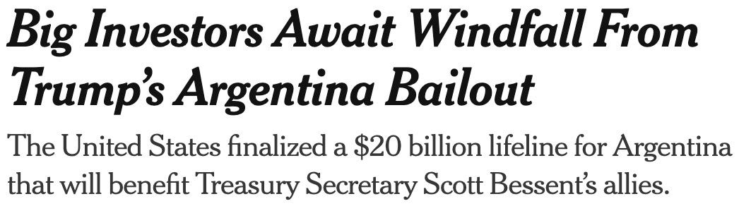what better time than for Donny Convict and Scott Bessent to shovel 20 billion dollars into the pockets of Argentina’s president?