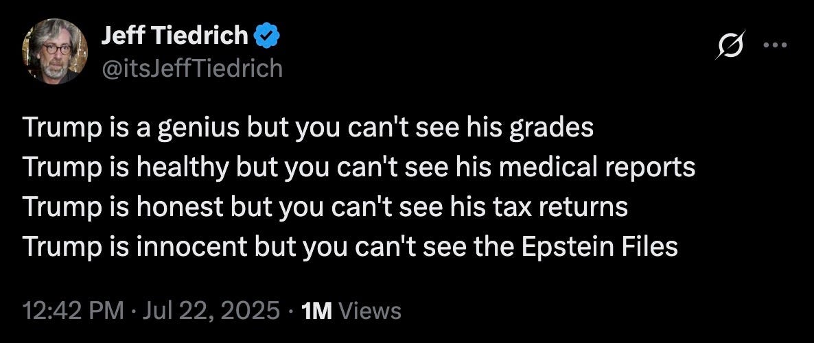holy shit. the family of raccoons living inside Donny’s head have finally chewed through all the wires. it is inconceivable that someone would be told they need an MRI, and not ask ‘why? what for?’