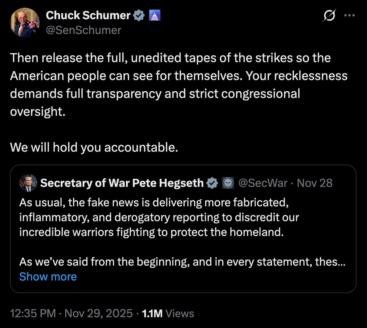 “Then release the full, unedited tapes of the strikes so the American people can see for themselves. Your recklessness demands full transparency and strict congressional oversight. We will hold you accountable.”