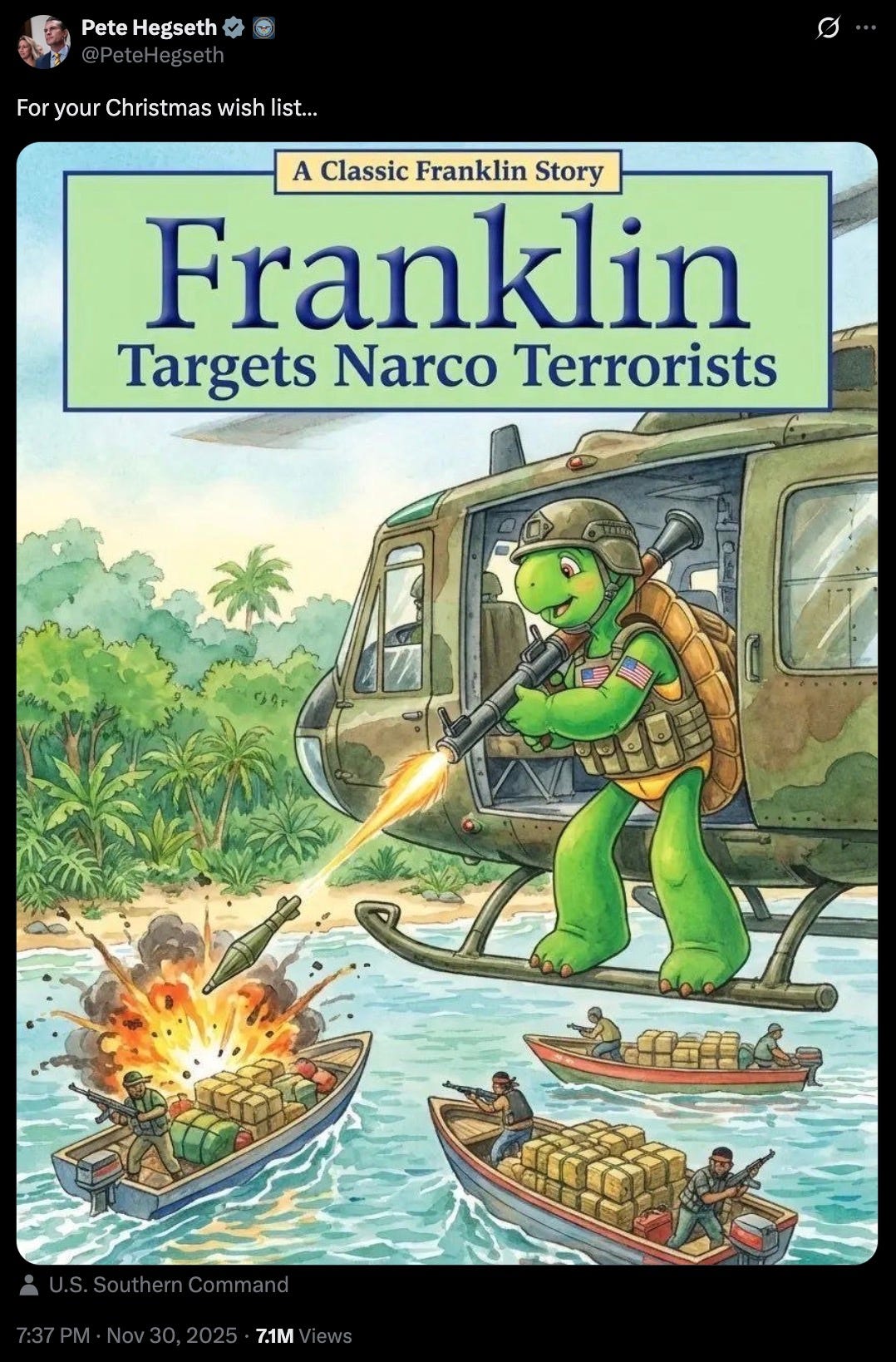 Pete sure seems to think that bombing the shit out of fishing boats is hilarious. he’s over on Elon’s Nazi Bar, making infantile jokes.
