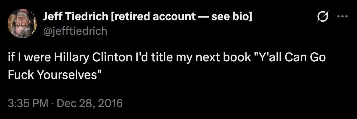 Hillary was one hundred percent correct about what America would be like under the reign of a Mad King Donny — and how did America respond? by telling her to shut the fuck up and go away and learn to knit.