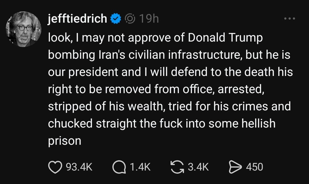 pro tip for Ron Johnson and his ilk: if you had done your fucking jobs and voted in favor of that war powers resolution that would have constrained Dear Leader’s ability to bomb the shit out of Iran, we wouldn’t even be having this conversation right now. so don’t come whining to me about how terrible it is have to hope and pray that the madman you enabled is just blowing smoke about murdering an entire country. you had the power to stop it — and and you did nothing.