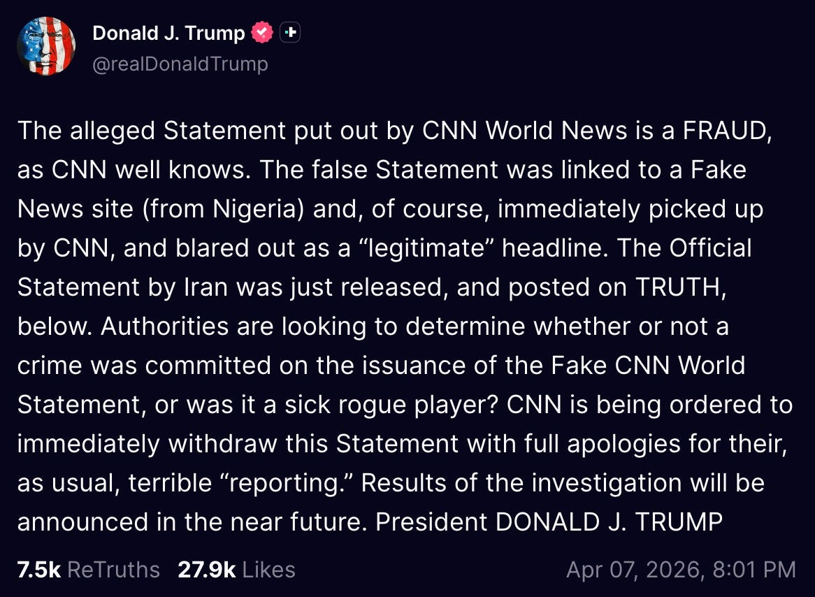 oh wait, the stupid shit isn’t finished. Donny’s worked himself into a Big Mad over CNN’s reporting of what Iran claims was the deal he agreed to.