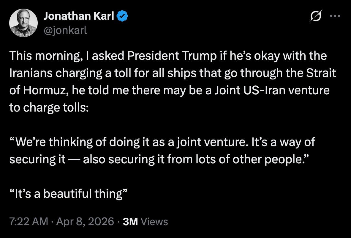 This morning, I asked President Trump if he’s okay with the Iranians charging a toll for all ships that go through the Strait of Hormuz, he told me there may be a Joint US-Iran venture to charge tolls: