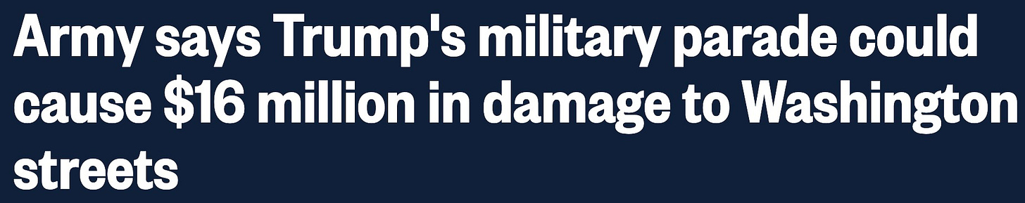 hey, do you know what the Boy King’s Big Love-Me Birthday Parade is costing? 45 million dollars — $16 million of which is just to repair the damage to DC’s streets that will be caused by hundreds of tanks rolling across them.