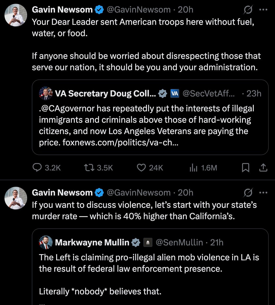 every time you think Donny’s reached the bottom of the barrel, he somehow manages to kick his way though and go even lower. he turns every public appearance into a highly-politicized campaign rally. here he is, goading assembled troops at Fort Bragg into booing Gavin Newsom and Los Angeles Mayor Karen Bass.