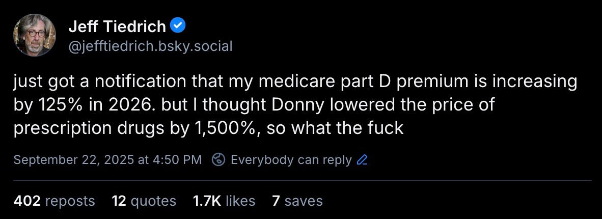 keep raising the cost of everyone’s healthcare. keep raising the cost of everything, due to your incoherent tariff polities.