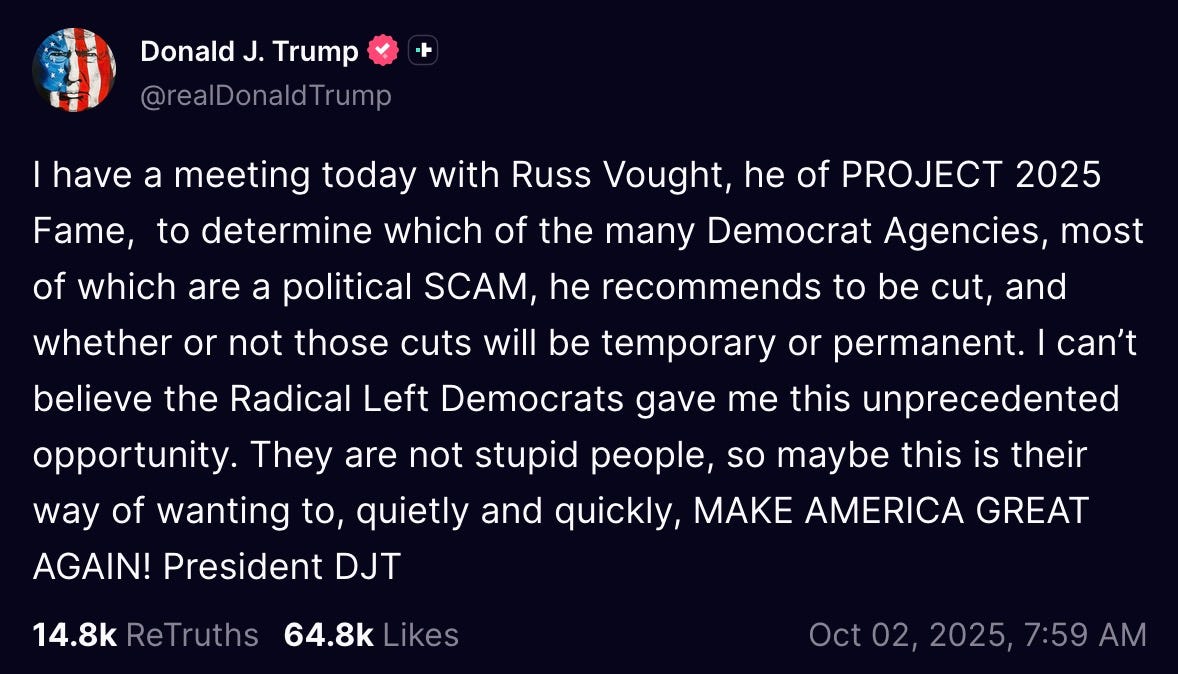 “I have a meeting today with Russ Vought, he of PROJECT 2025 Fame, to determine which of the many Democrat Agencies, most of which are a political SCAM, he recommends to be cut, and whether or not those cuts will be temporary or permanent. I can’t believe the Radical Left Democrats gave me this unprecedented opportunity. They are not stupid people, so maybe this is their way of wanting to, quietly and quickly, MAKE AMERICA GREAT AGAIN! President DJT”