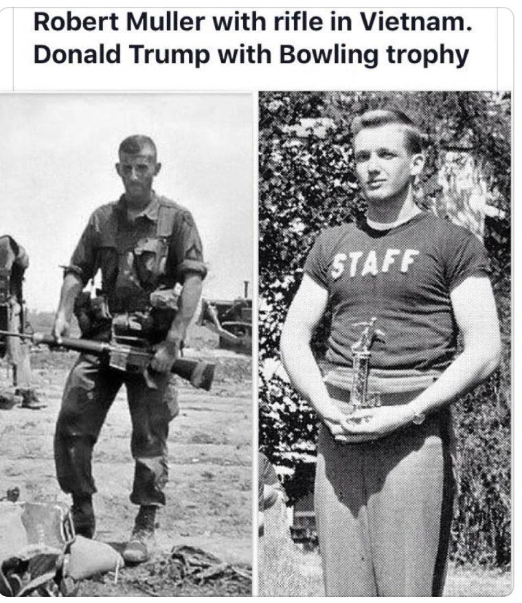 Robert Mueller volunteered to serve in Vietnam. Little Donny Fuckface volunteered to grab women by the pussy, in case you need a comparison of the characters of these two individuals.