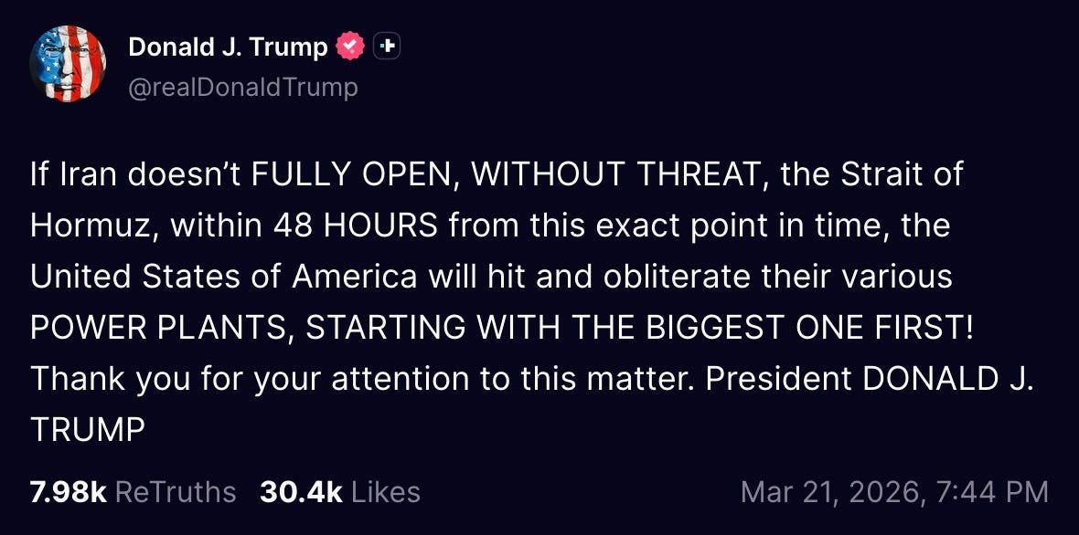 and now, barely 24 hours after that last statement about how it’s up to our allies to open the Strait, now Donny’s threatening to bomb shit out of Iran’s energy infrastructure if they don’t open the Strait.
