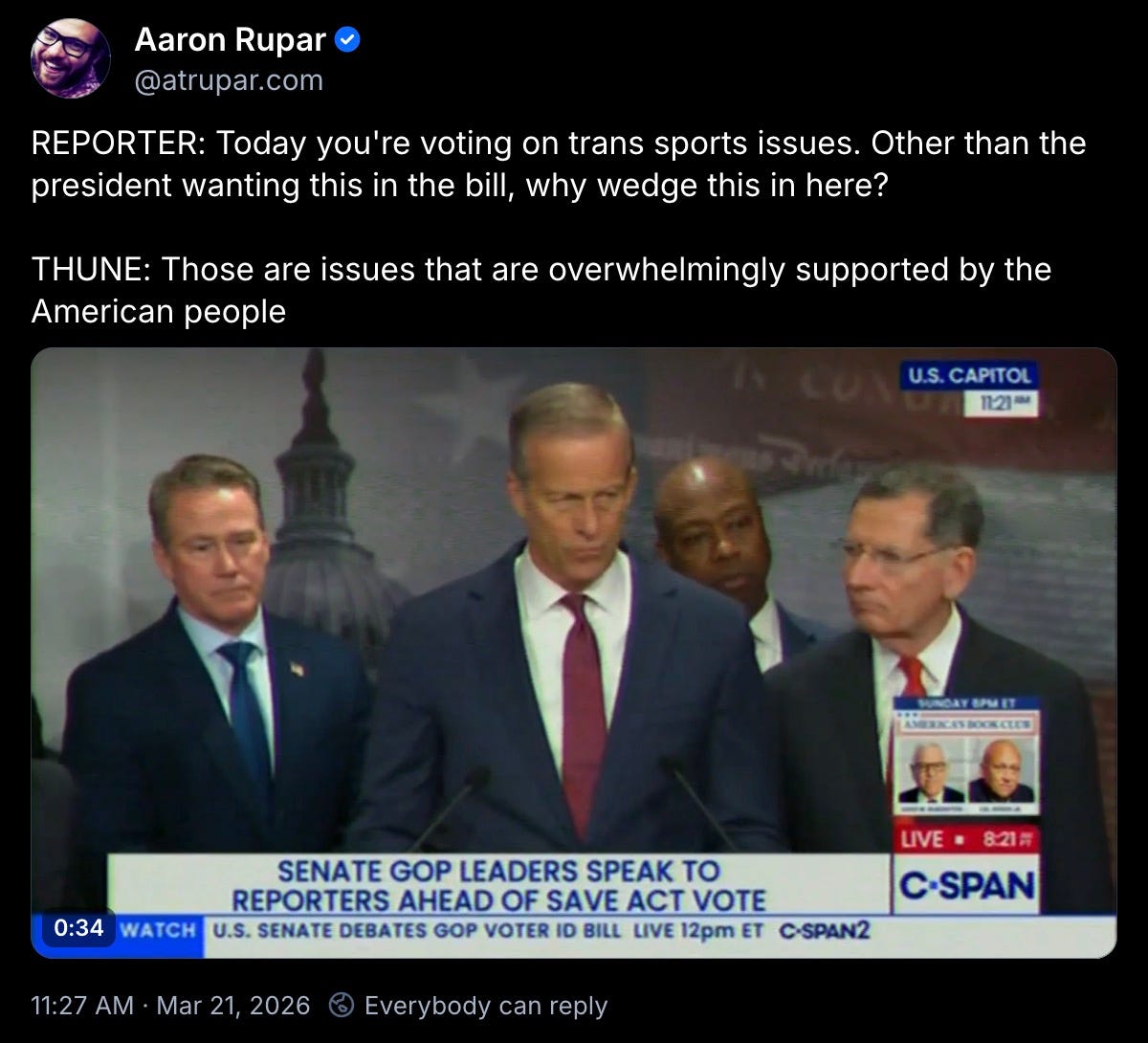 apparently not — because instead of working to solve anything that matters, here’s what Senate Republicans were voting on yesterday: trans people in sports.