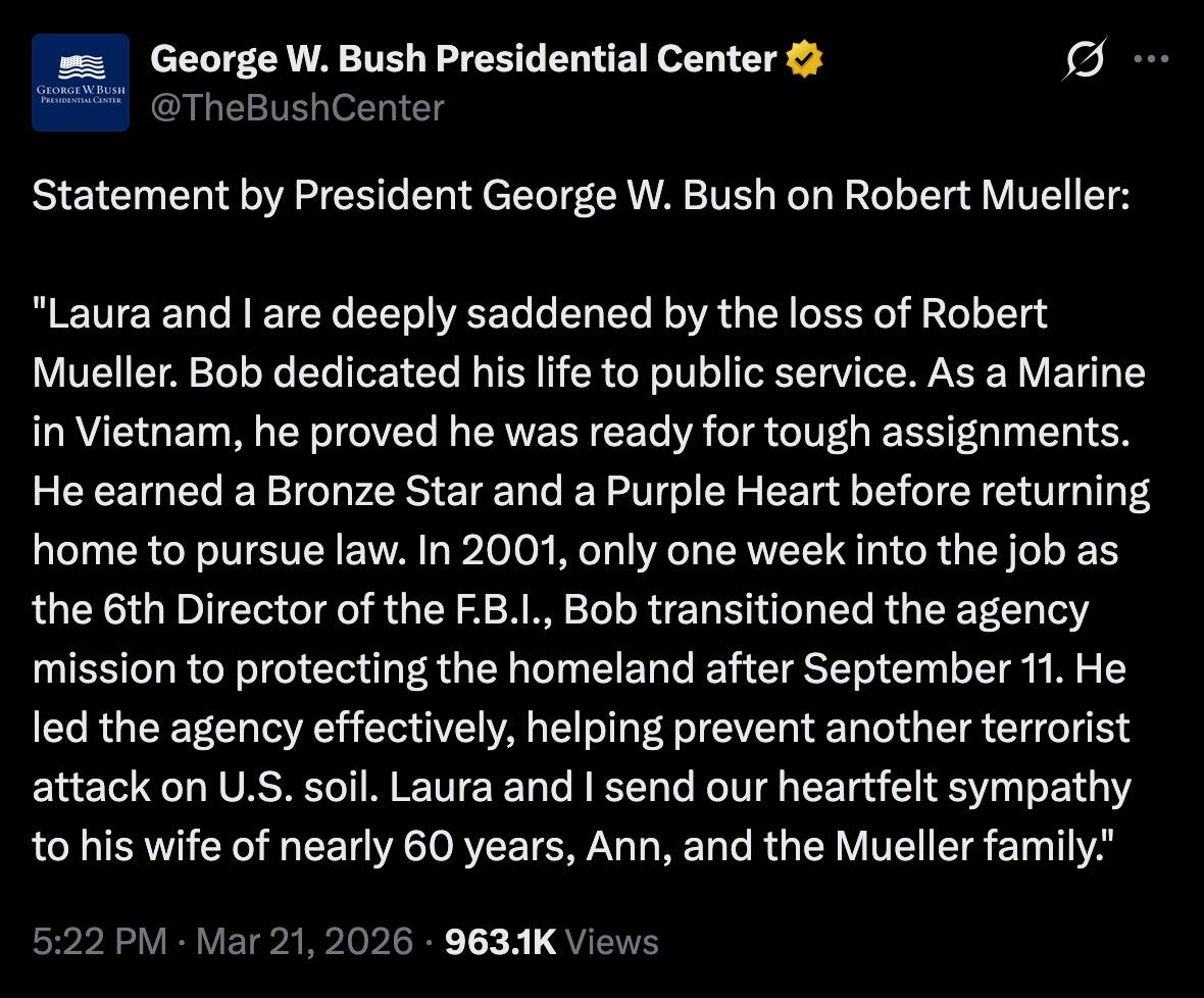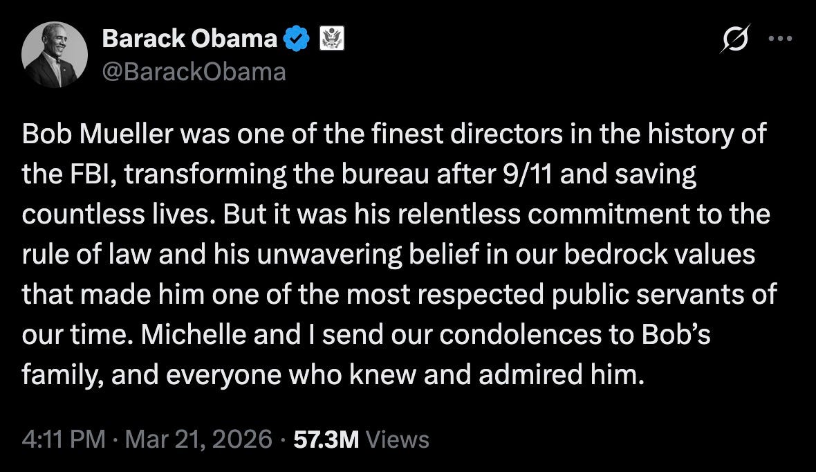 Bob Mueller was one of the finest directors in the history of the FBI, transforming the bureau after 9/11 and saving countless lives. But it was his relentless commitment to the rule of law and his unwavering belief in our bedrock values that made him one of the most respected public servants of our time. Michelle and I send our condolences to Bob’s family, and everyone who knew and admired him.