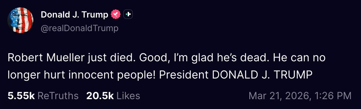 “Robert Mueller just died. Good, I’m glad he’s dead. He can no longer hurt innocent people! President DONALD J. TRUMP”