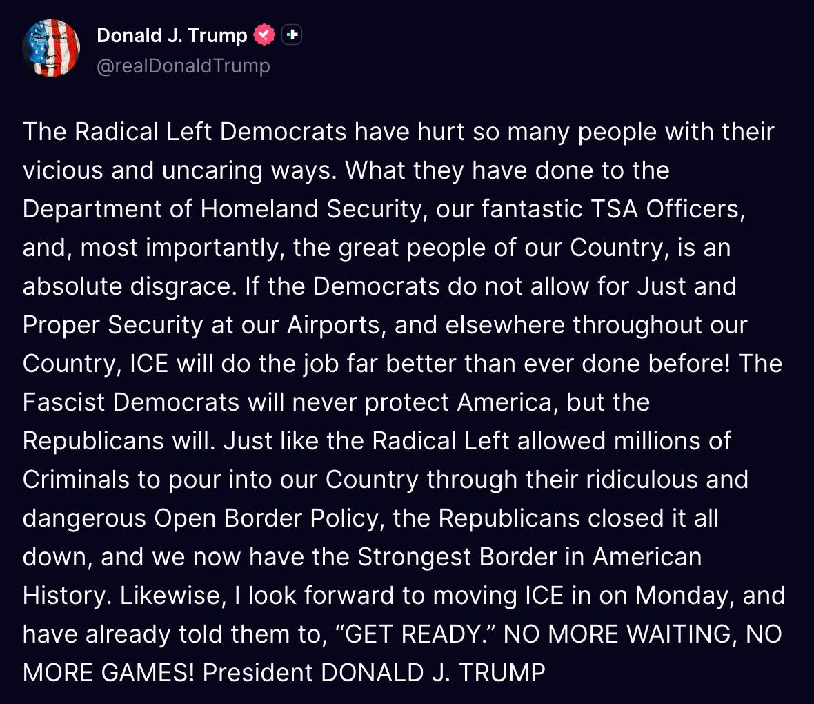 ICE shitwads who have no clue how to do airport security jobs are going create more problems than they solve — but that’s the point. as always, Donny gives away the game by screaming the quiet part out loud. he isn’t offering to replace TSA workers with ICE thugs — he’s threatening to do it.