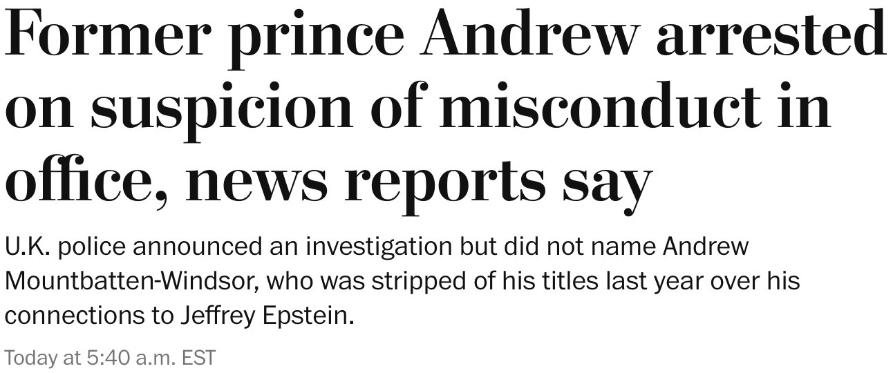 Andrew Mountbatten-Windsor was arrested Thursday morning on suspicion of committing misconduct in public office, according to the Associated Press and BBC.