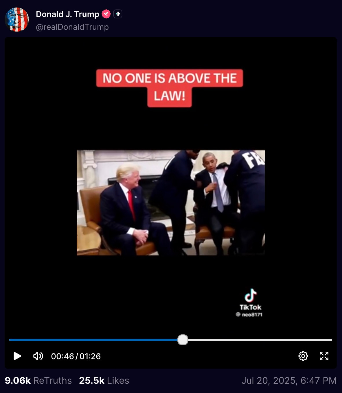 and, finally, we got to the pièce de résistance: AI-generated slop of Barack HUSSEIN Obama being arrested by the FBI.
