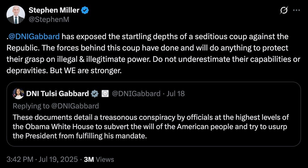 the only thing you need to know about this latest Obama-did-a-treason fairy tale is that Donny’s name is on every page of the Epstein Files.