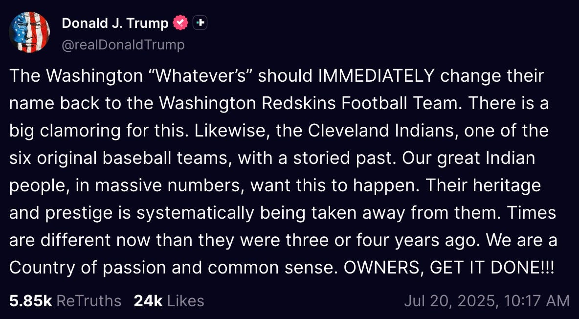 “The Washington ‘Whatever’s’ should IMMEDIATELY change their name back to the Washington Redskins Football Team. There is a big clamoring for this. Likewise, the Cleveland Indians, one of the six original baseball teams, with a storied past. Our great Indian people, in massive numbers, want this to happen. Their heritage and prestige is systematically being taken away from them. Times are different now than they were three or four years ago. We are a Country of passion and common sense. OWNERS, GET IT DONE!!!”