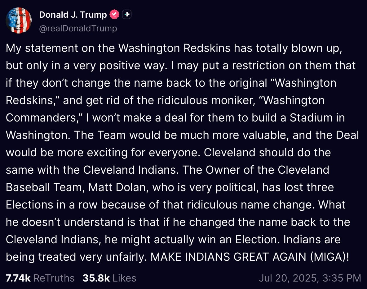 “My statement on the Washington Redskins has totally blown up, but only in a very positive way. I may put a restriction on them that if they don’t change the name back to the original “Washington Redskins,” and get rid of the ridiculous moniker, “Washington Commanders,” I won’t make a deal for them to build a Stadium in Washington. The Team would be much more valuable, and the Deal would be more exciting for everyone. Cleveland should do the same with the Cleveland Indians. The Owner of the Cleveland Baseball Team, Matt Dolan, who is very political, has lost three Elections in a row because of that ridiculous name change. What he doesn’t understand is that if he changed the name back to the Cleveland Indians, he might actually win an Election. Indians are being treated very unfairly. MAKE INDIANS GREAT AGAIN (MIGA)!”